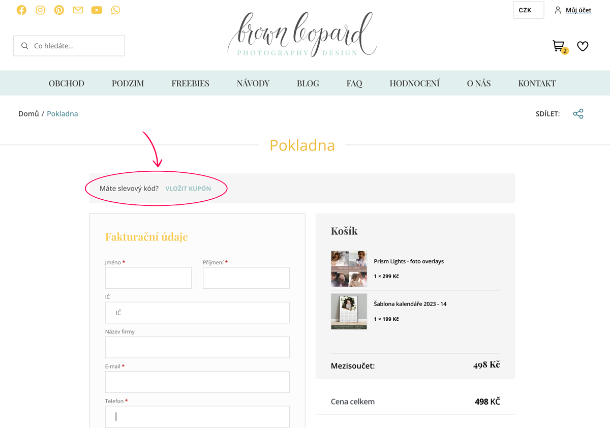 Při zadávání fakturačních údajů uvidíte v horní části stránky šedý banner s nápisem „Máte slevový kód?“ Klikněte na „VLOŽIT KUPÓN“, zadejte kód a krok potvrďte kliknutím na „POUŽÍT KUPÓN”.