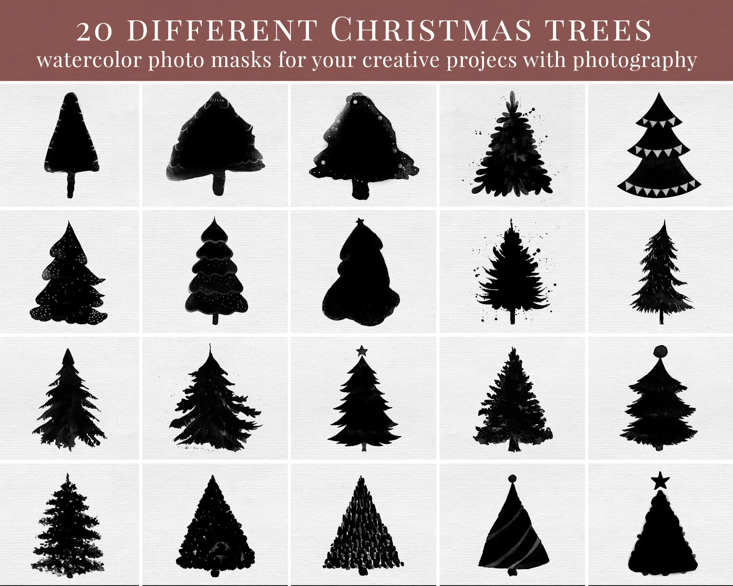 Balíček 20 různých foto masek s motivem vánočního stromečku s akvarelovým efektem.