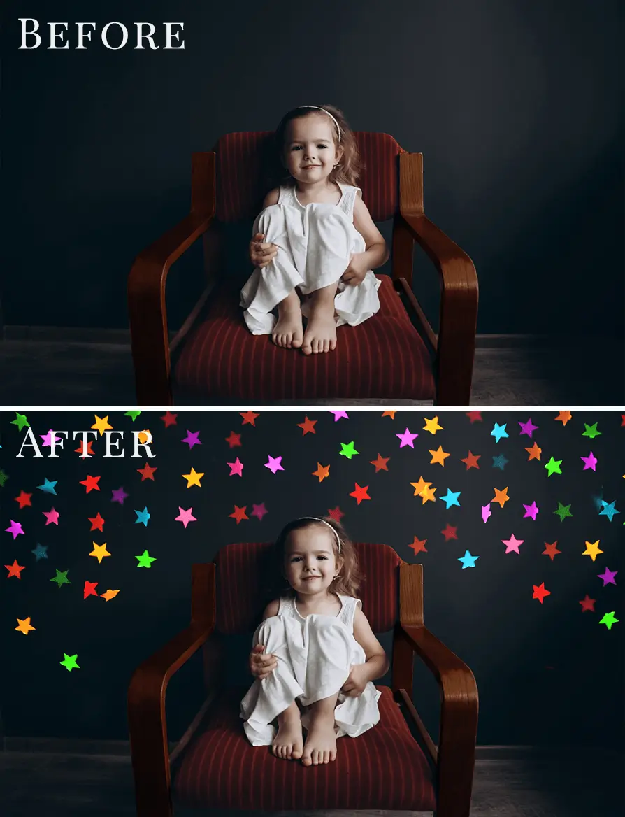 16 různých hvězdičkových foto overlays pro nadcházející vánoční sezónu – překvapte své klienty originálními fotkami. Velmi snadné použití – „drag & drop“ = stačí pouze přetáhnout a zvolit vhodný layer mode.