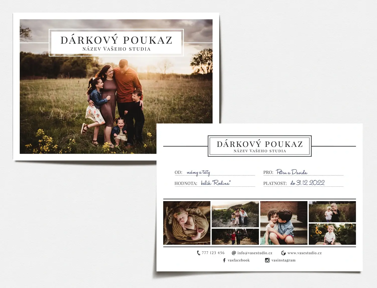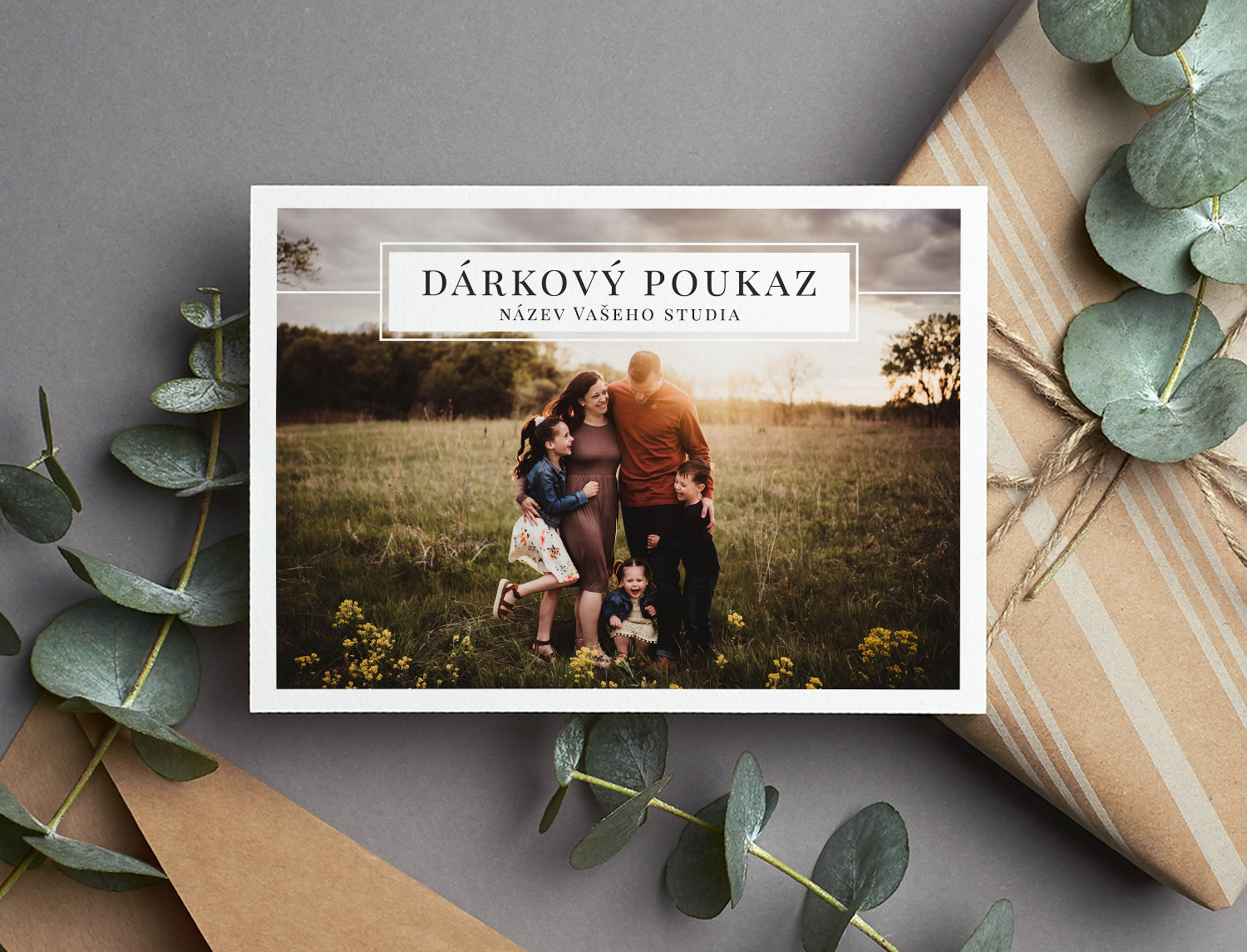 Designová šablona dárkového poukazu na focení. Zachraňte vaše klienty krásným last minute dárkem.