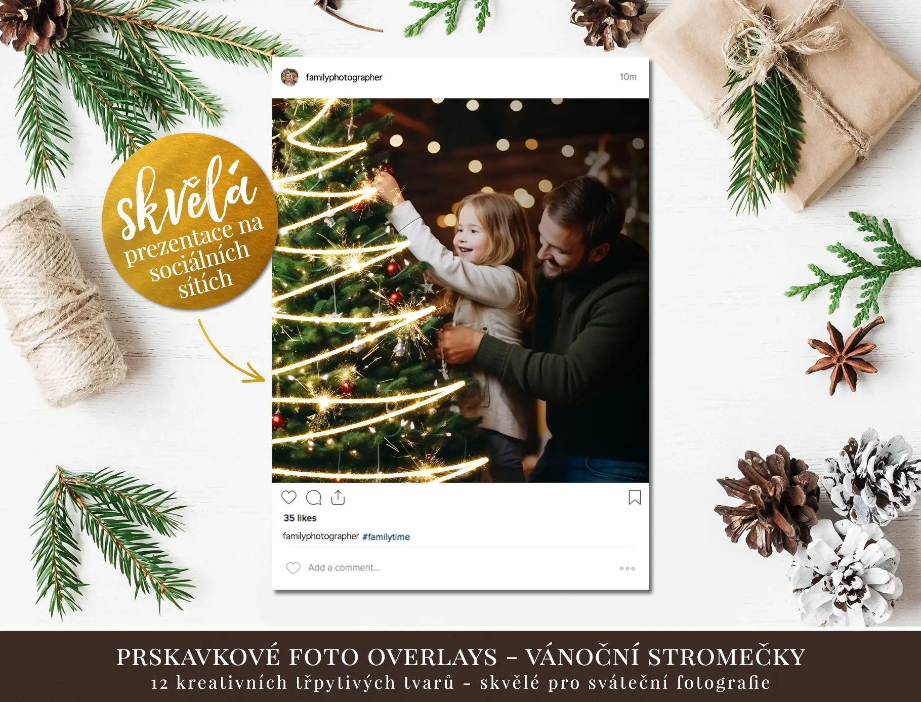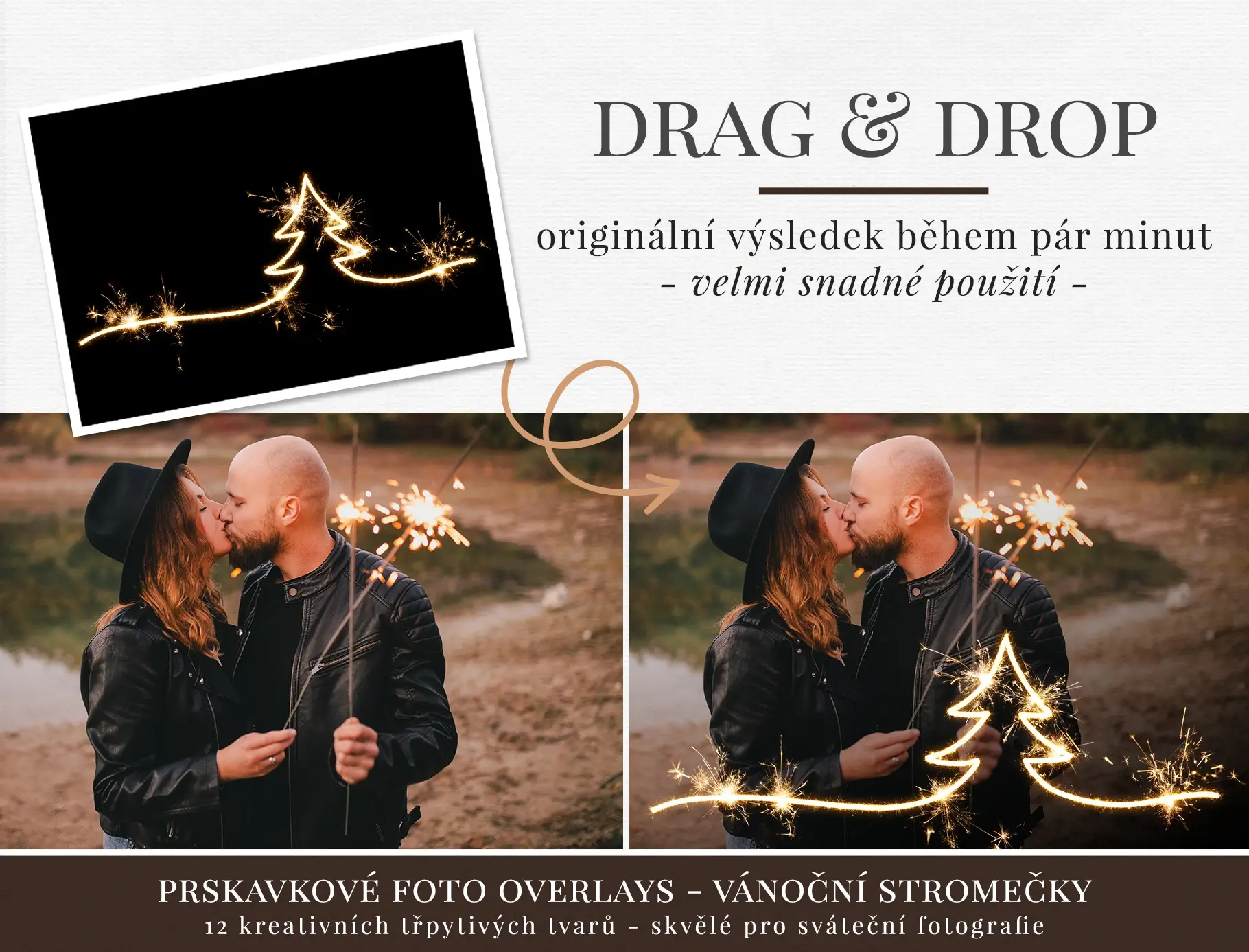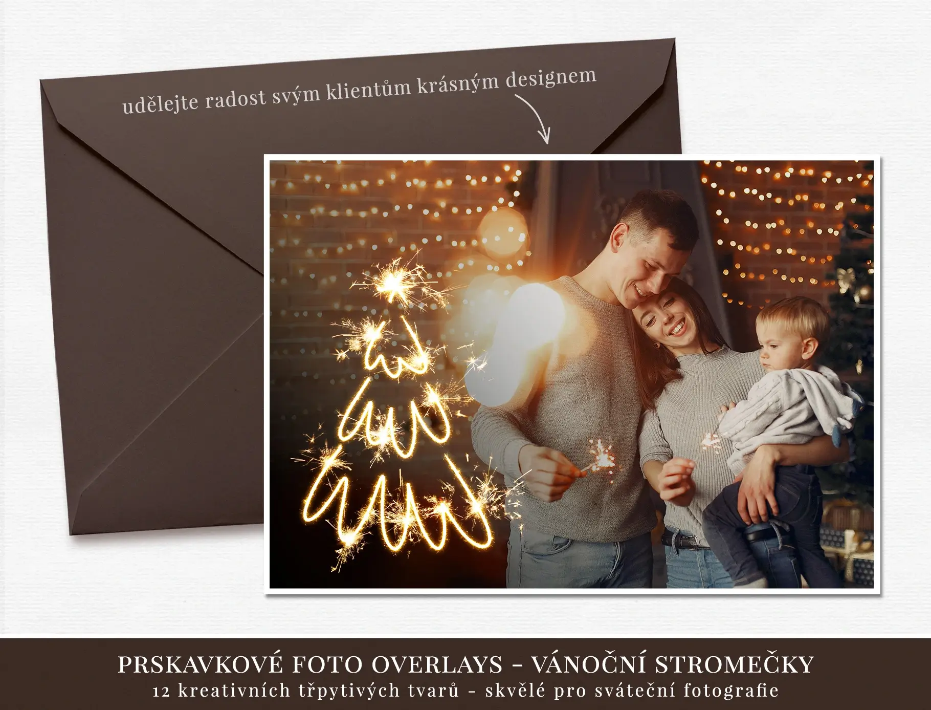 Vytvořte pro vaše klienty originální přání k Vánocům z jejich vlastních fotek. A nebo jim sami popřejte kreativní formou. Pomůže vám s tím balíček 12 symbolů v krásném prskavkovém designu.