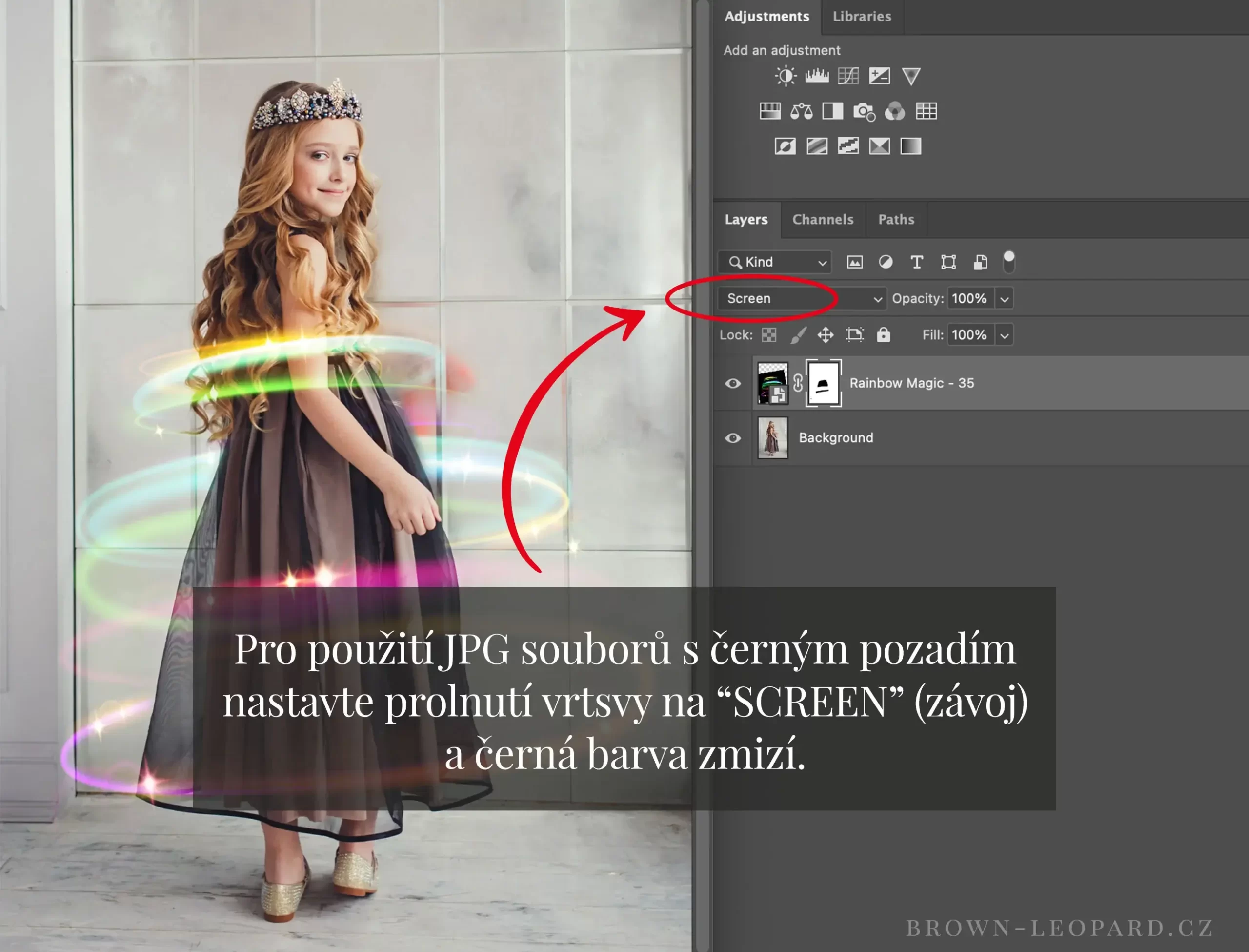 designy mají černé pozadí, nastavte proto prolnutí vrstvy na SCREEN (závoj) a černá barva zmizí