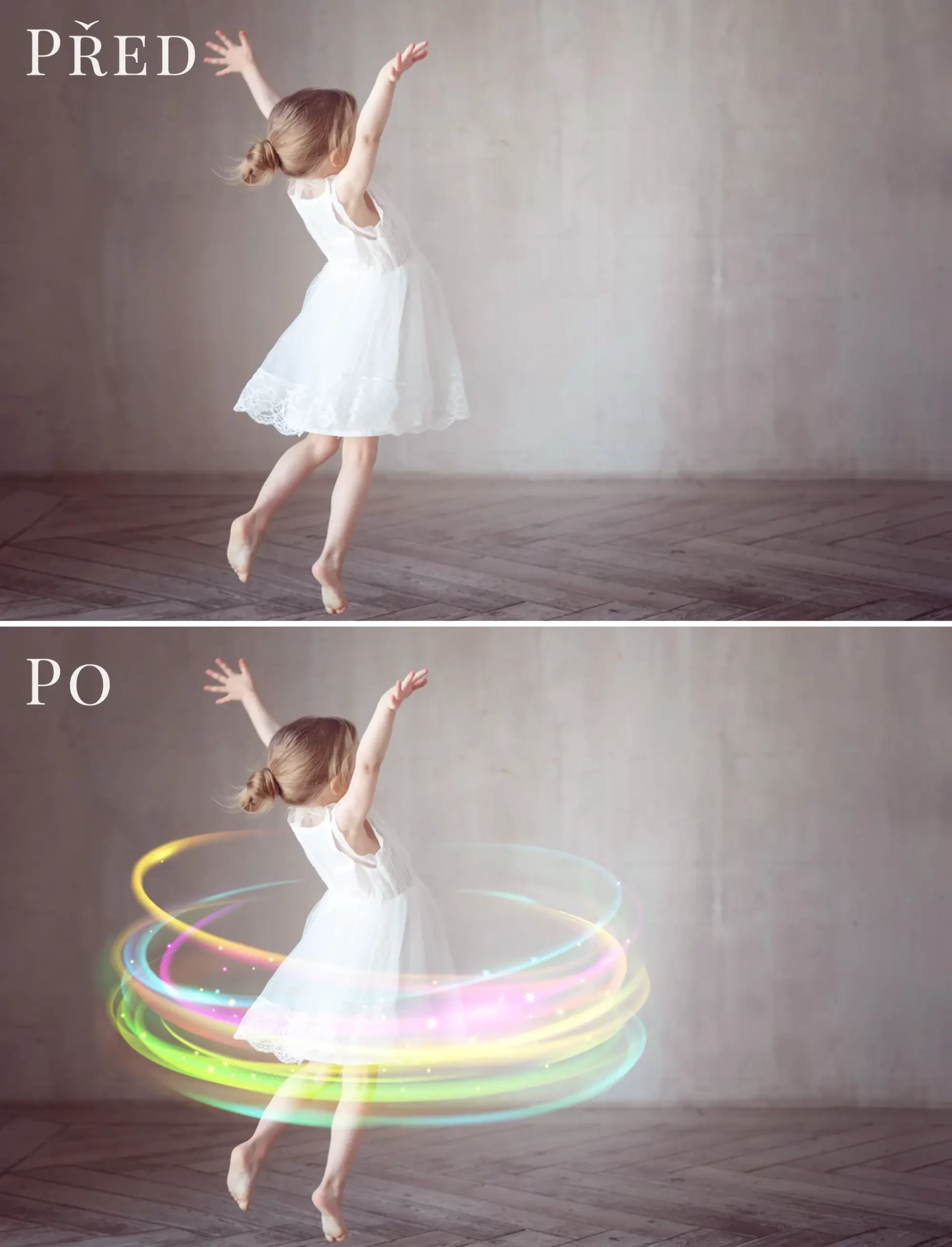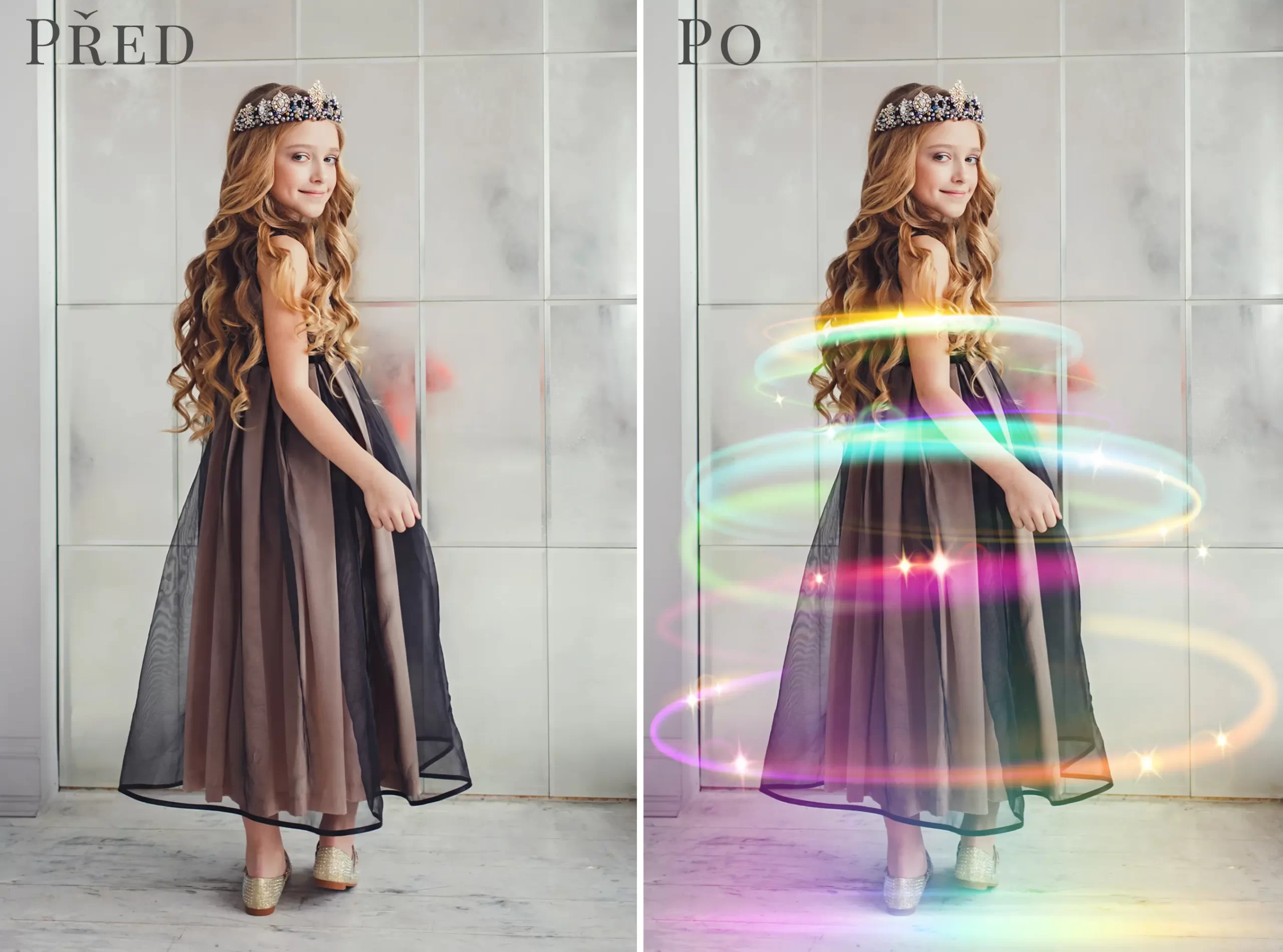 Balíček 48 různých foto overlays s kouzelnými duhovými efekty. Během chvilky rozzáříte dětské portréty a dodáte jim tak pohádkovou atmosféru. Skvěle se hodí pro princeznovské nebo narozeninové fotky.