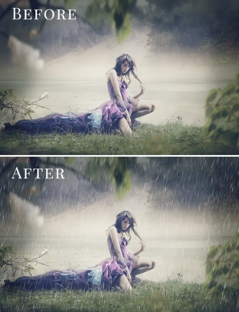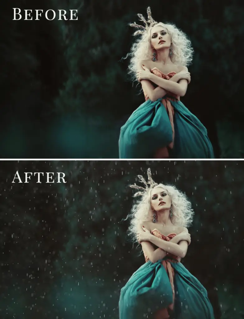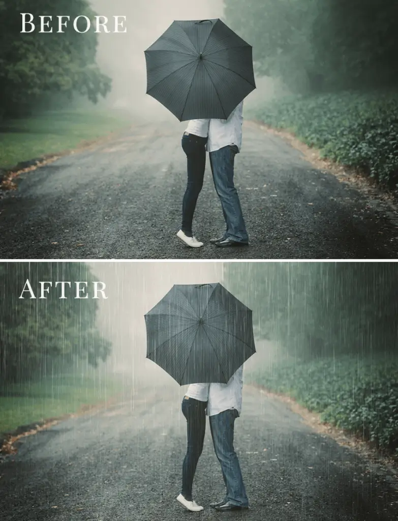 Balíček 20 různých foto overlays s motivy deště – od jarní spršky po pořádnou bouřku. Vašim fotkám dodá sychravou podzimní atmosféru s výsledkem, který bude k nerozeznání od reality. Skvěle se hodí pro kreativní portrétní nebo třeba párové focení.