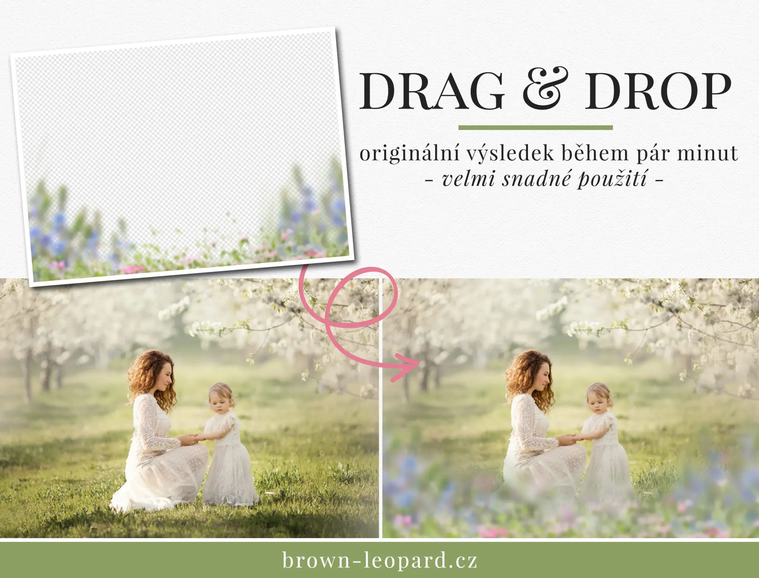 Jednoduché použití drag & drop – overlay pouze přetáhnete myší do vaší fotografie. Můžete si pohrát s velikostí, umístěním, rozostřením, barevným tónováním, atd.