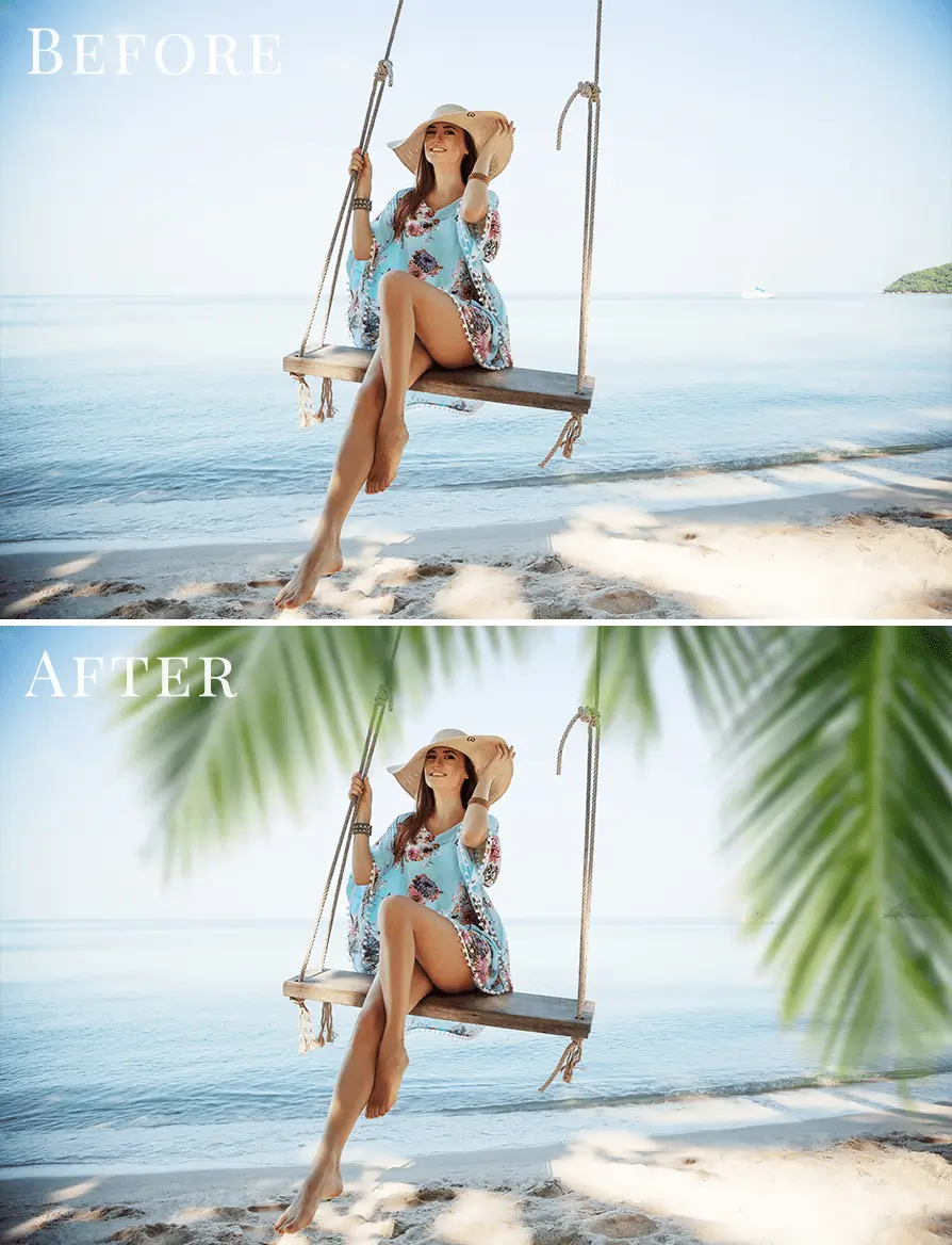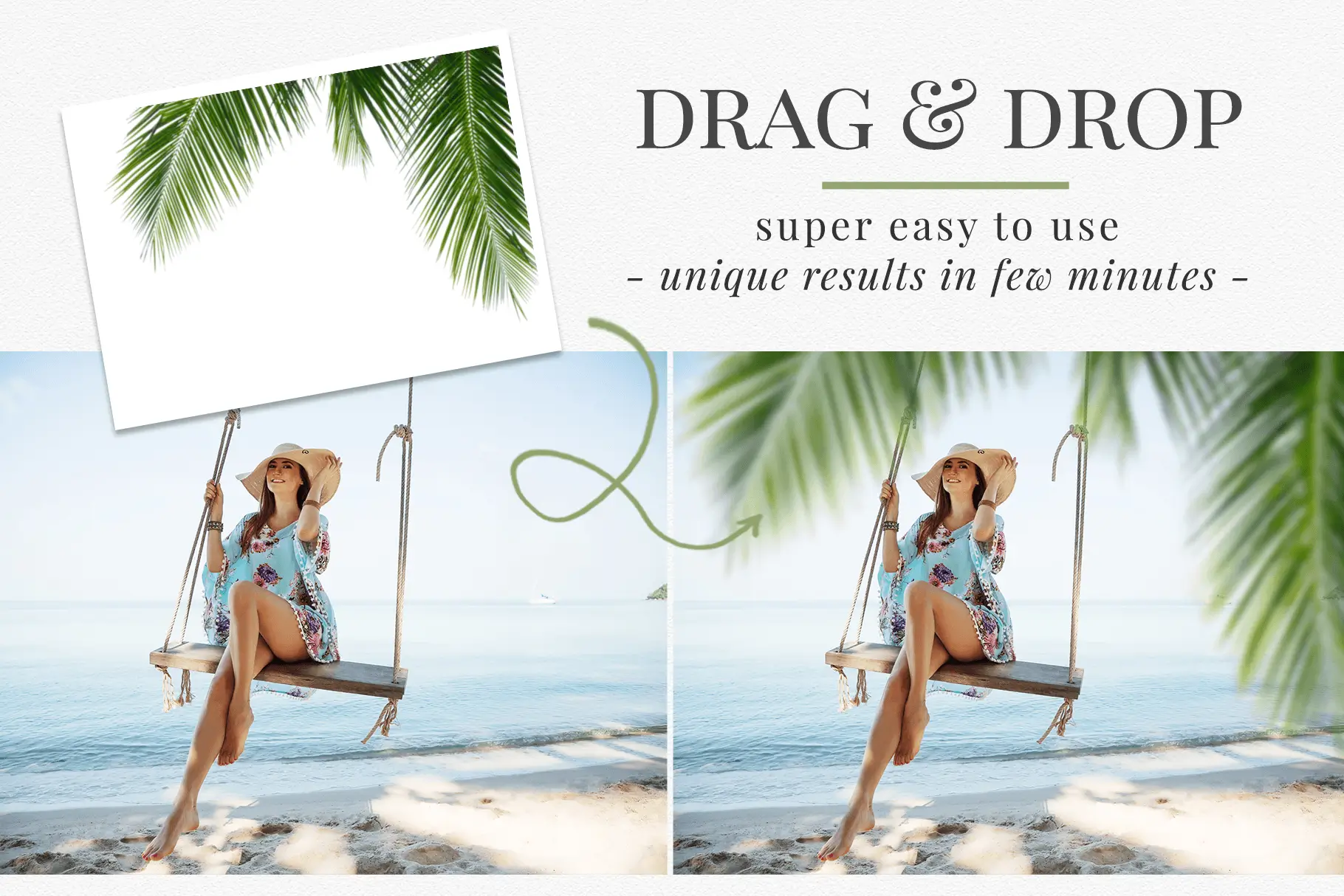 Kreativní foto overlays s palmovými listy – efekt rozostřeného popředí, skvělý pomocník pro vaše prázdninové focení. Velmi snadné použití – „drag & drop“ – stačí pouze přetáhnout, upravit velikost, umístění, tónování a během pár minut máte hotovo.
