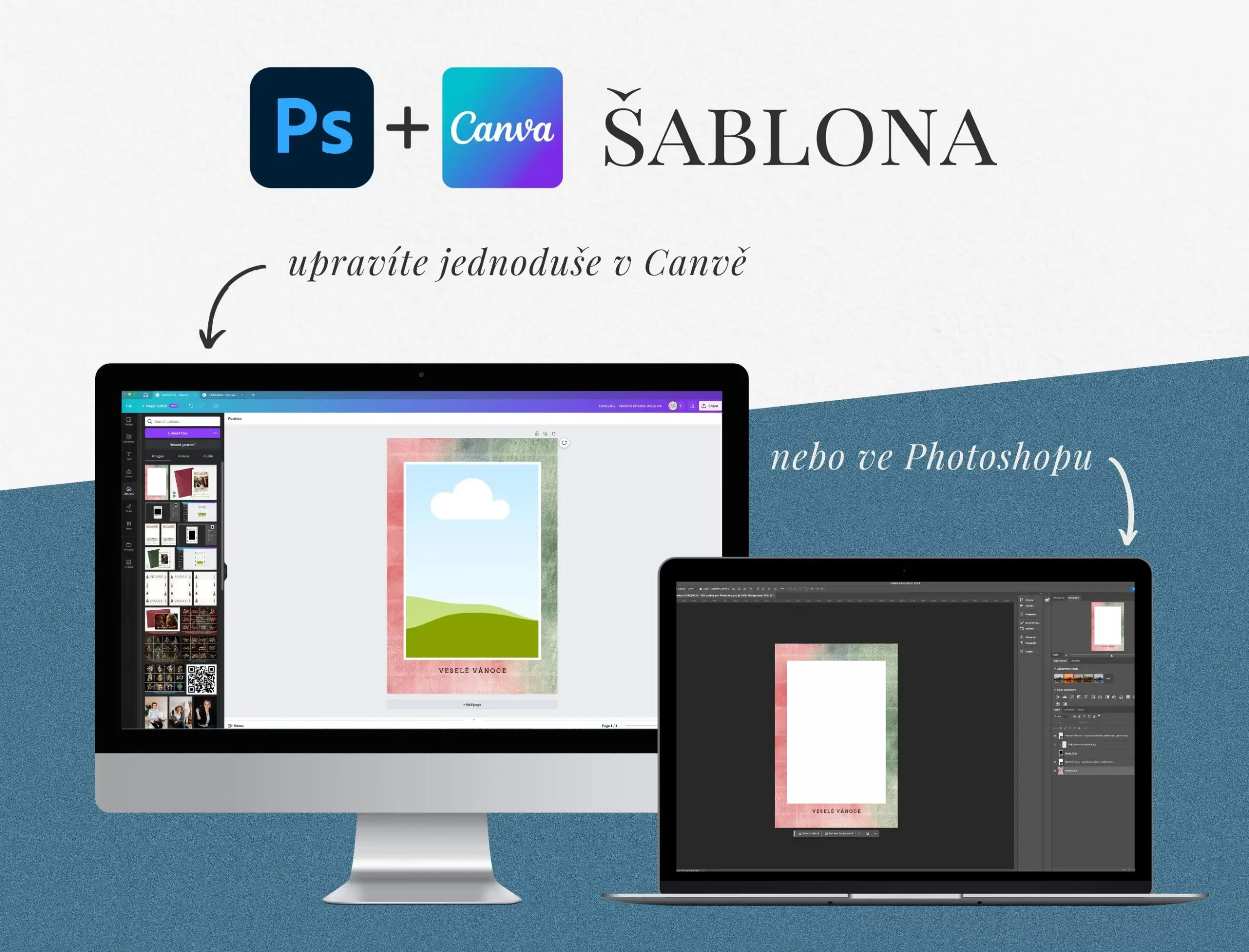Balíček obsahuje šablonu pro Adobe Photoshop & Photoshop Elements (vrstvený PSD soubor) a odkaz na editovatelnou šablonu v Canvě.