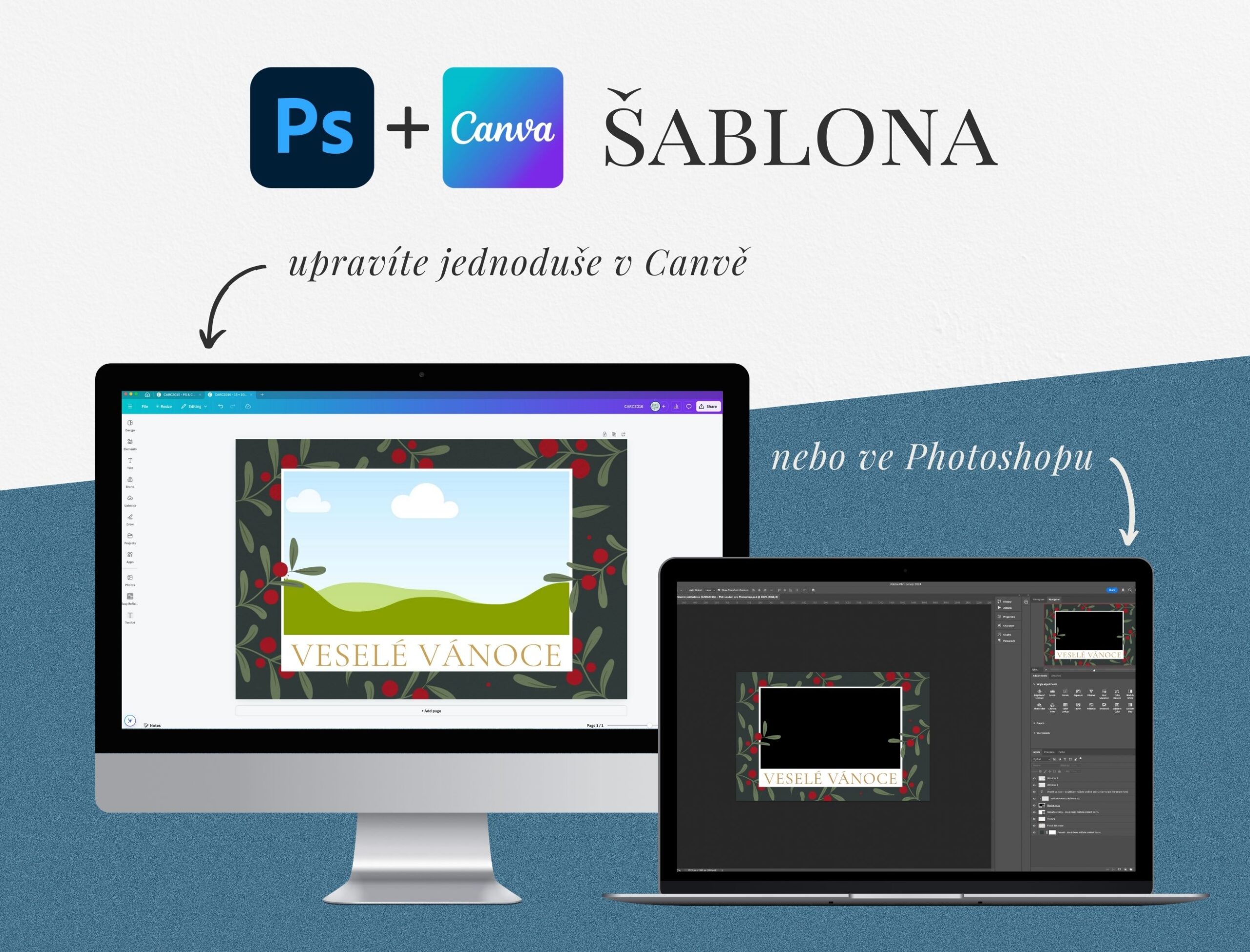Balíček obsahuje šablonu pro Adobe Photoshop & Photoshop Elements (vrstvený PSD soubor) a odkaz na editovatelnou šablonu v Canvě.