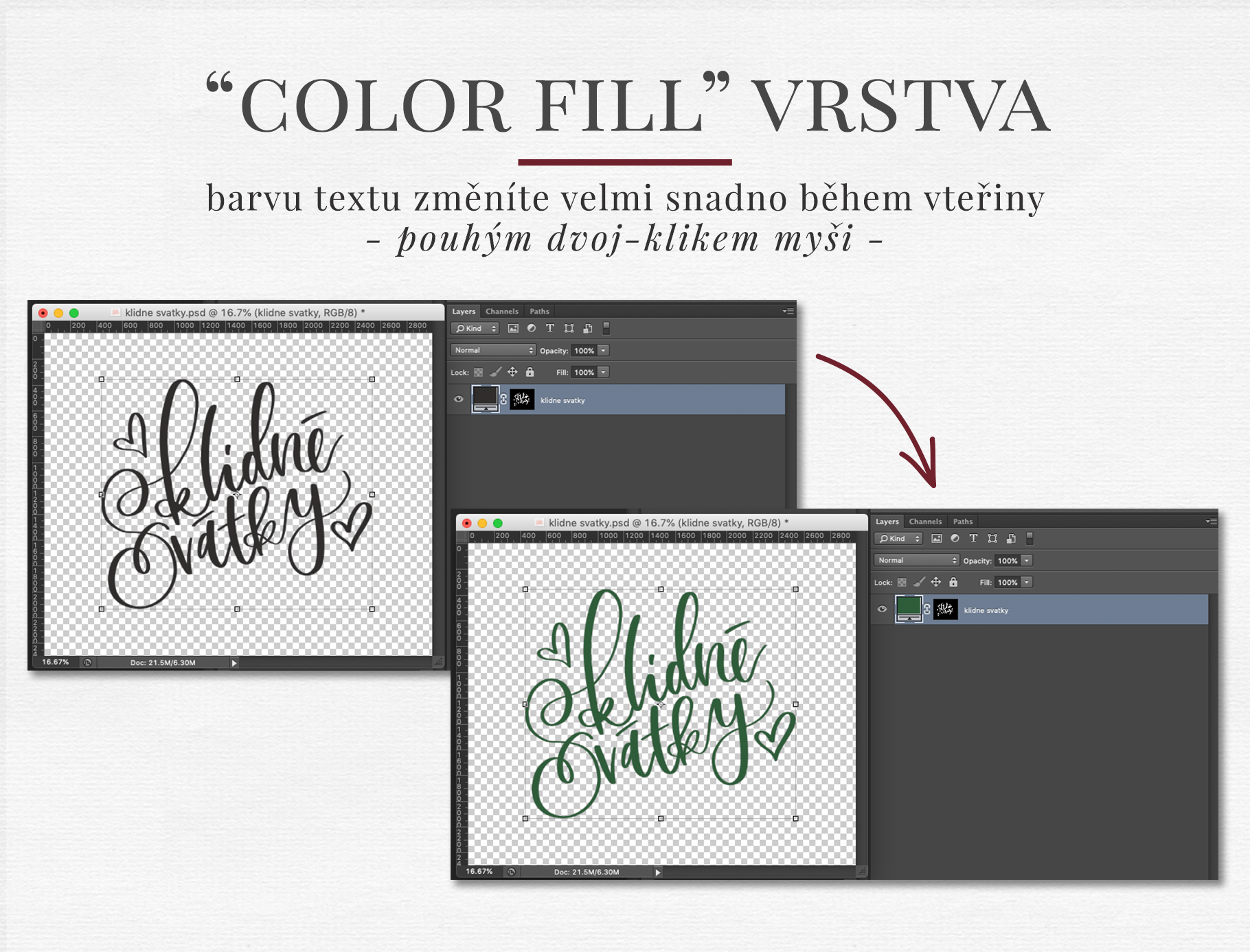 Balíček obsahuje 14 různých nápisů v bílém a černém provedení. Součástí produktu je také PSD formát ve variantě „color fill“ layer -> tzn. že dvoj-klikem myši snadno změníte barvu nápisu během pár vteřin.