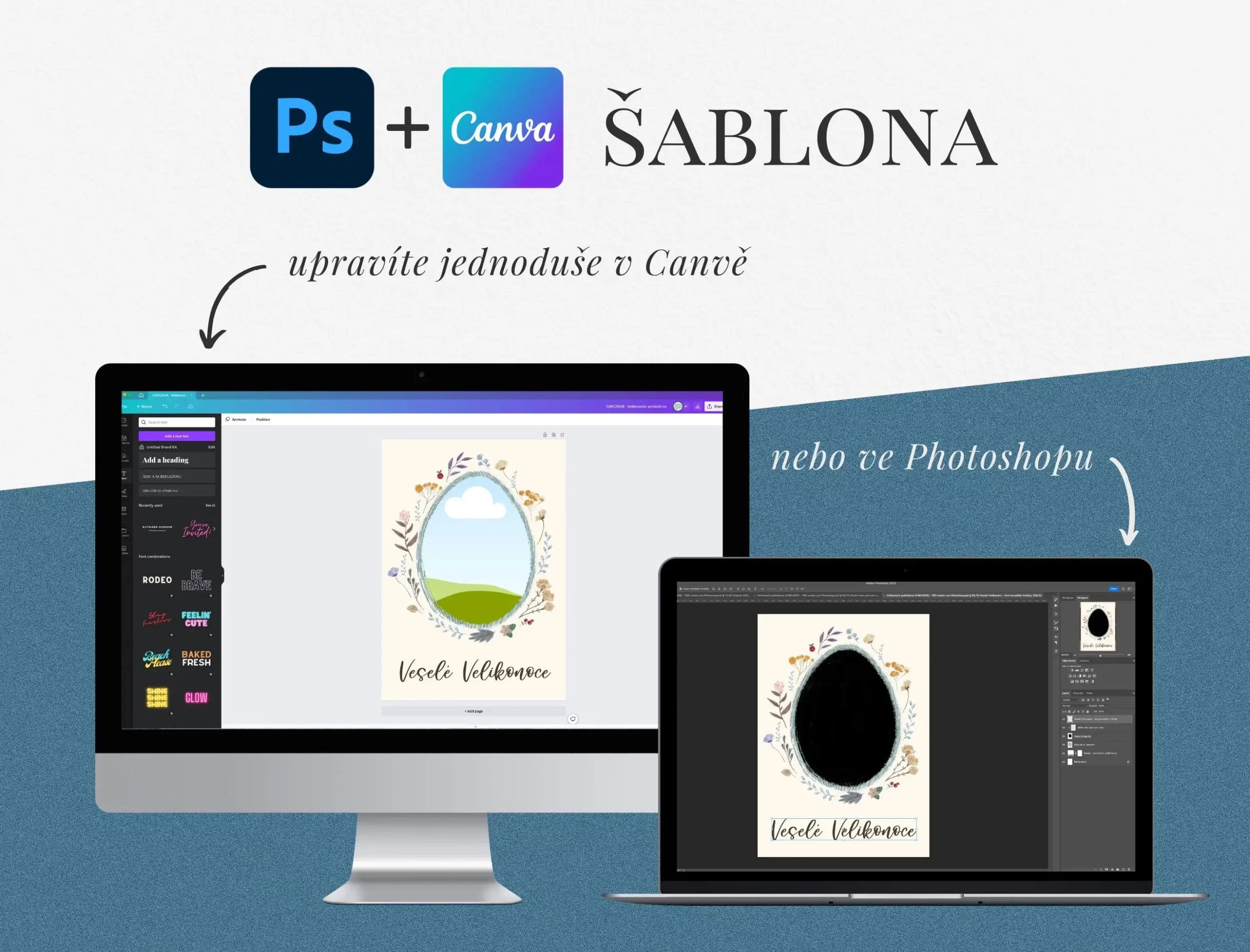 Balíček obsahuje šablonu pro Adobe Photoshop & Photoshop Elements (vrstvený PSD soubor) a odkaz na editovatelnou šablonu v Canvě.