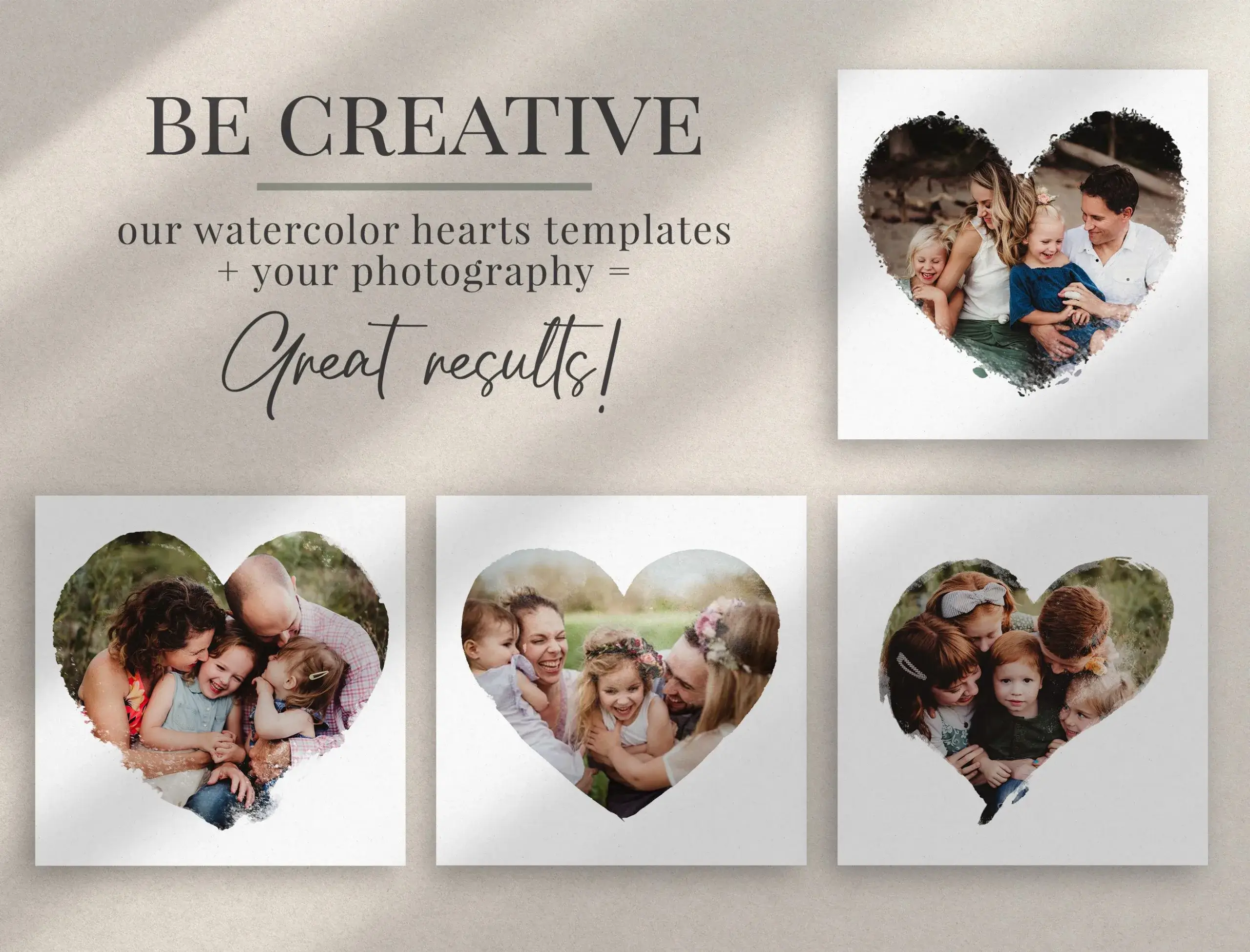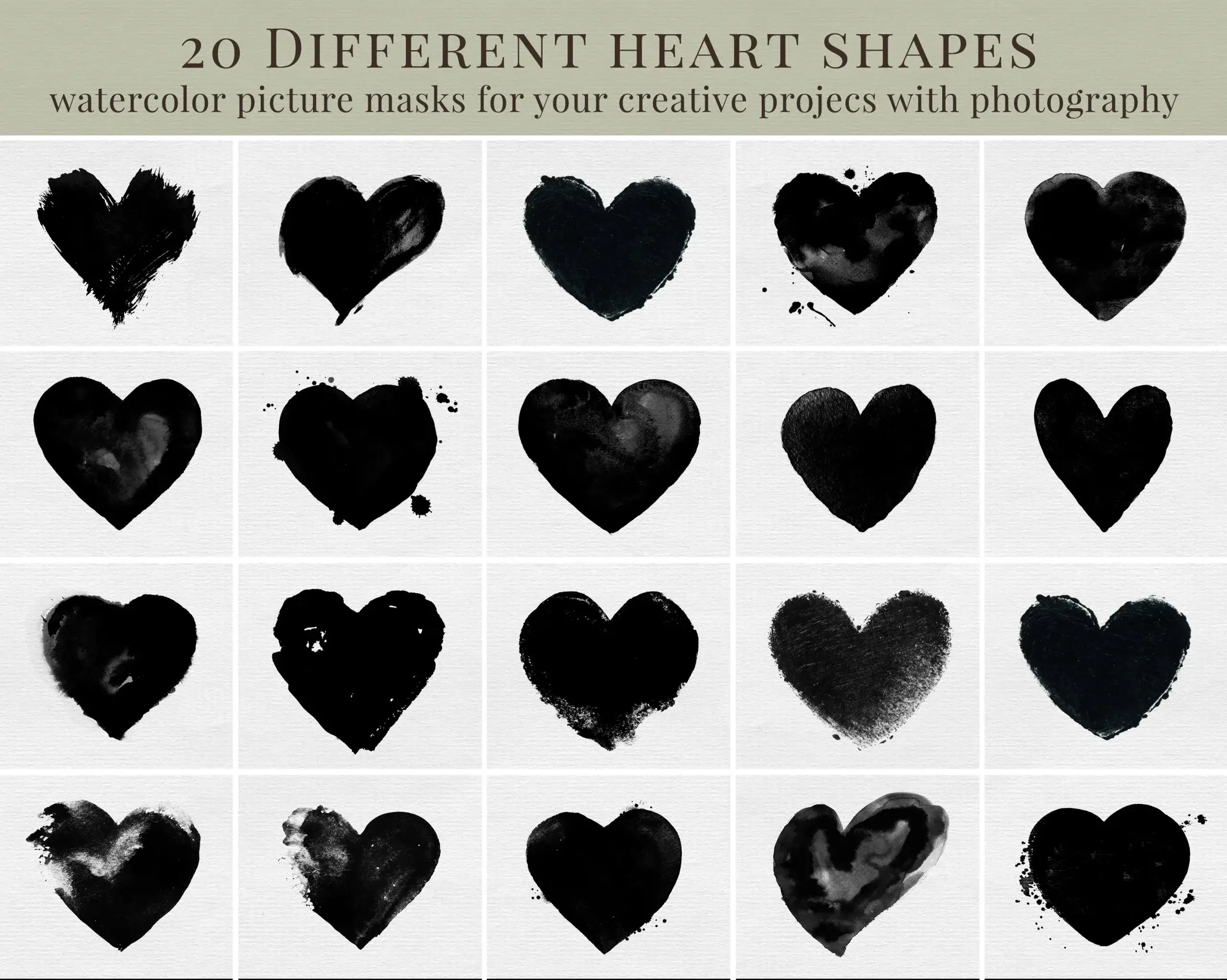 - 20 různých foto masek ve tvaru srdíček s akvarelovým efektem