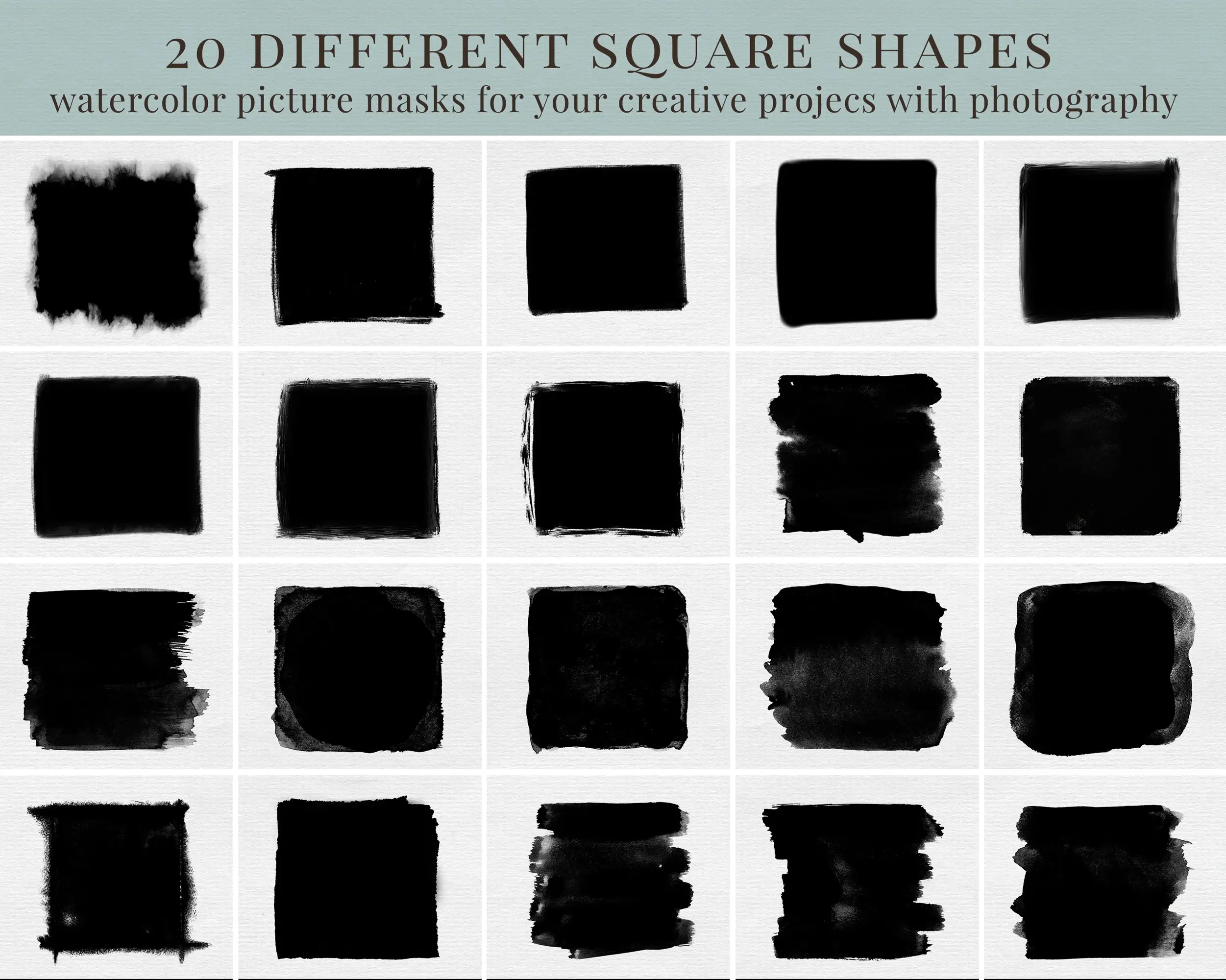 Balíček 20 různých foto masek čtvercového tvaru s akvarelovým efektem.