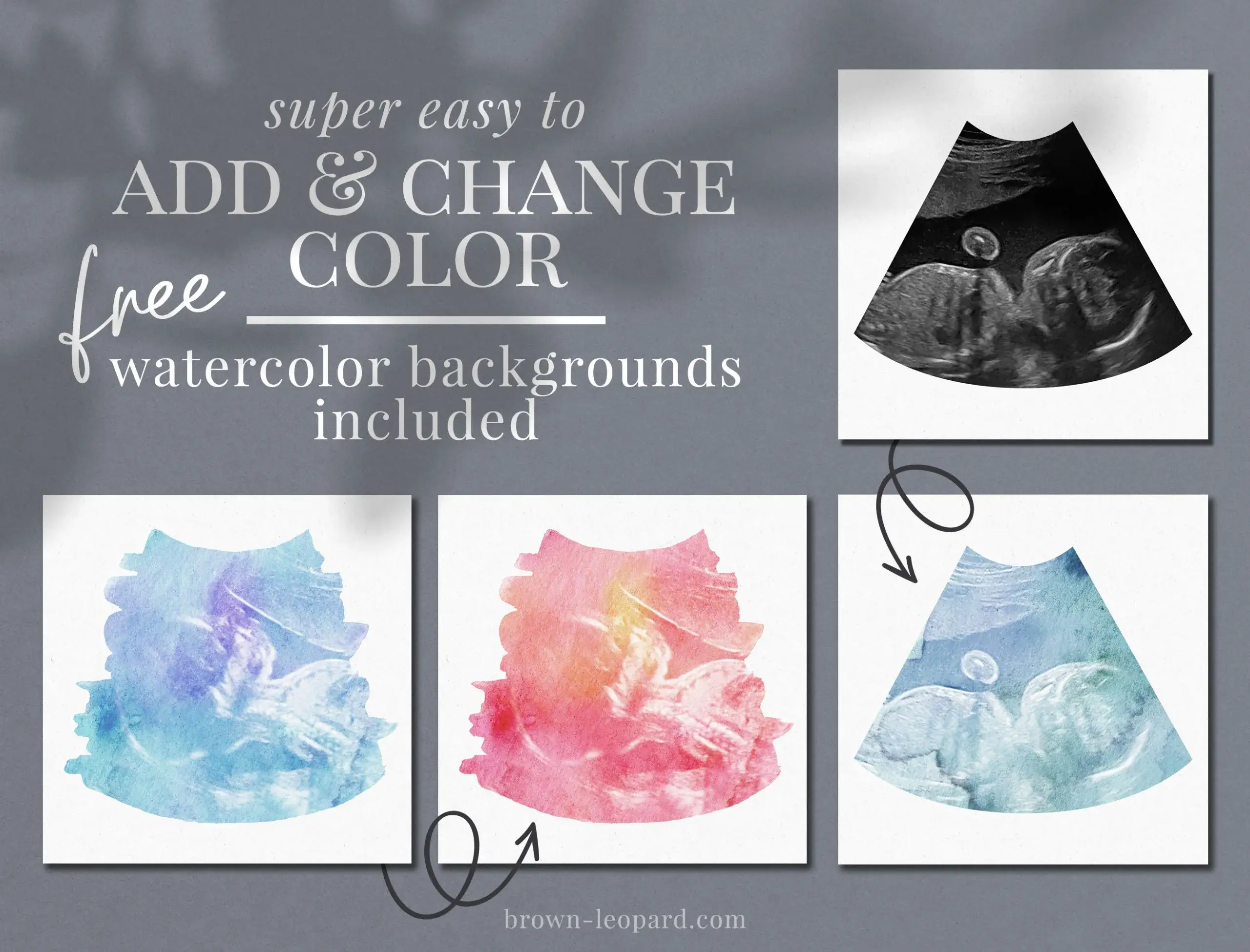 Balíček 20 foto masek s akvarelovým efektem vhodných pro fotky z ultrazvuku a 30 barevných pozadí, také s akvarelovým efektem.